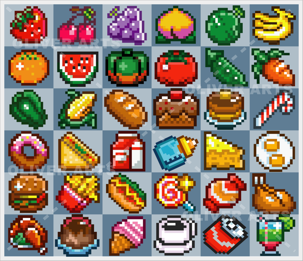 Pack of 36 vector pixel art icons of tasty foods and delights.