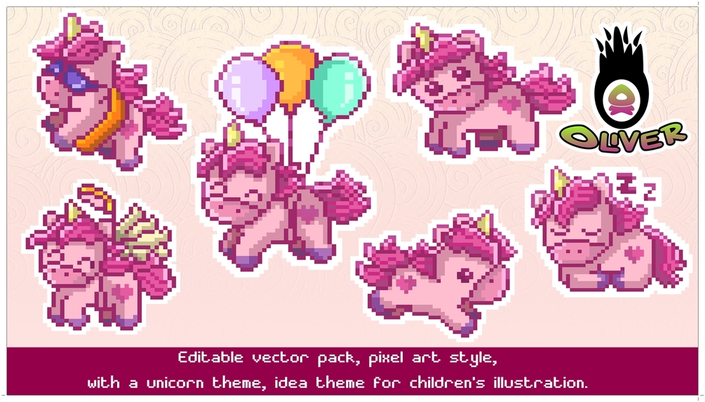 Editable vector pack, pixel art style, with a unicorn theme, idea theme for children's illustration.